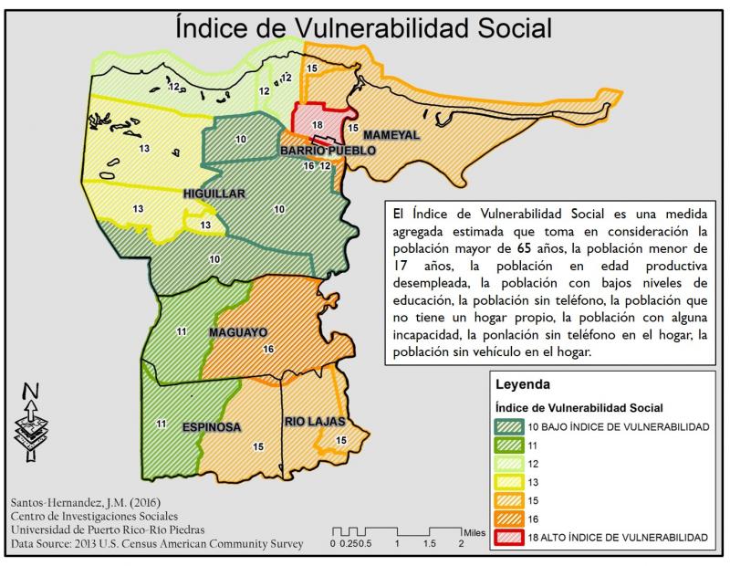 El Índice de Vulnerabilidad Social es una medida agregada georeferenciada que ayuda a visualizar las características de la población en una jurisdicción y su distribución espacial. La mayor contribución del Índice de Vulnerabilidad Social calculado es la capacidad de visualizar la acumulación de diferentes desventajas sociales en áreas geográficas específicas (Santos Hernández, 2007).