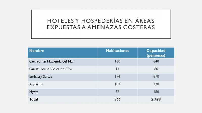 La costa de Dorado es un atractivo turístico internacional. En ella se ubican hoteles y hospederías. Asimismo, el Gobierno Municipal ha iniciado la construcción de un hotel. Estas facilidades necesitarían atención especial en caso de una emergencia. Se sugiere al Municipio solicitar los respectivos planes de manejo de emergencias y cultivar una cultura de colaboración con los encargados de seguridad de estas facilidades.